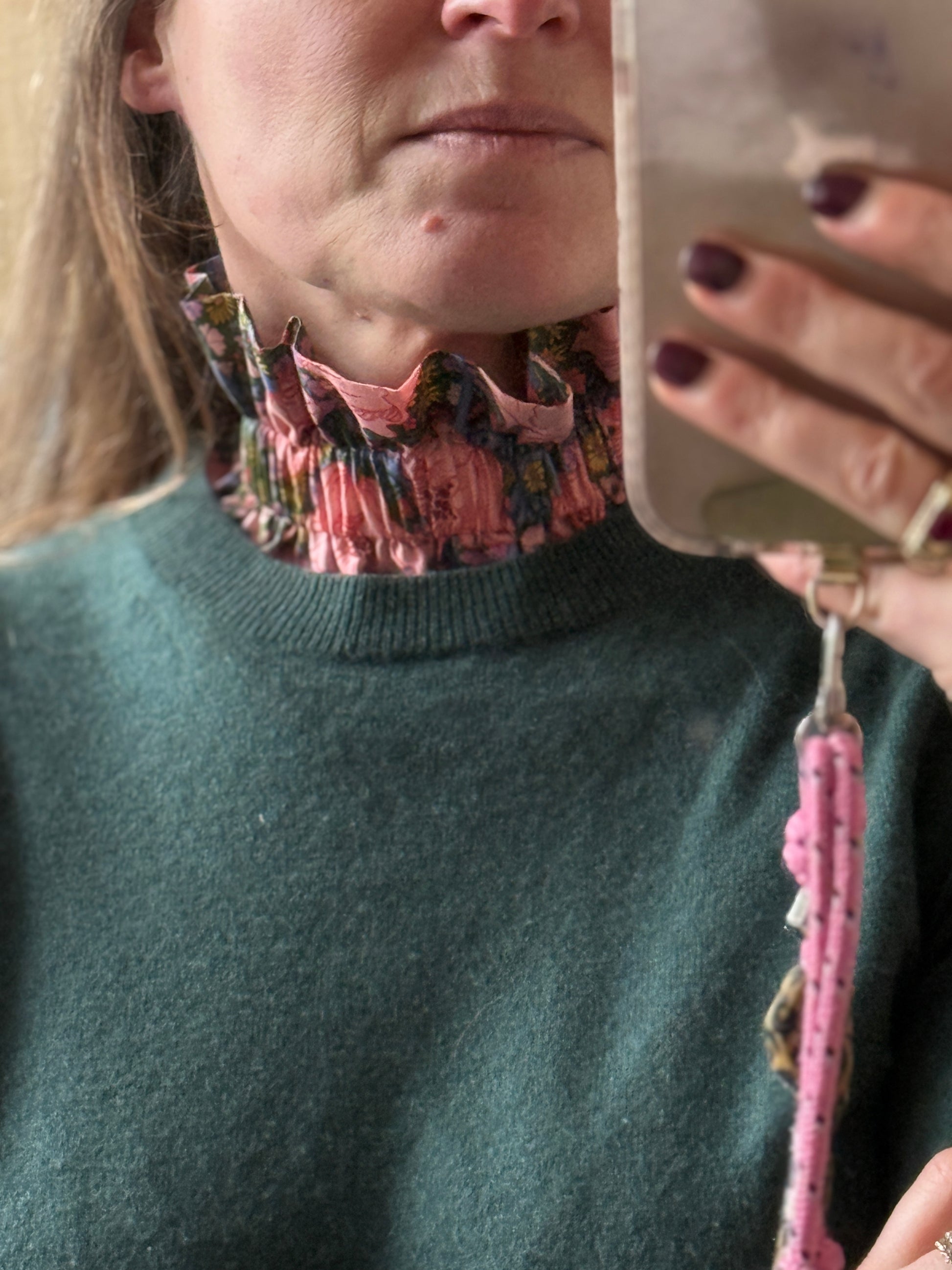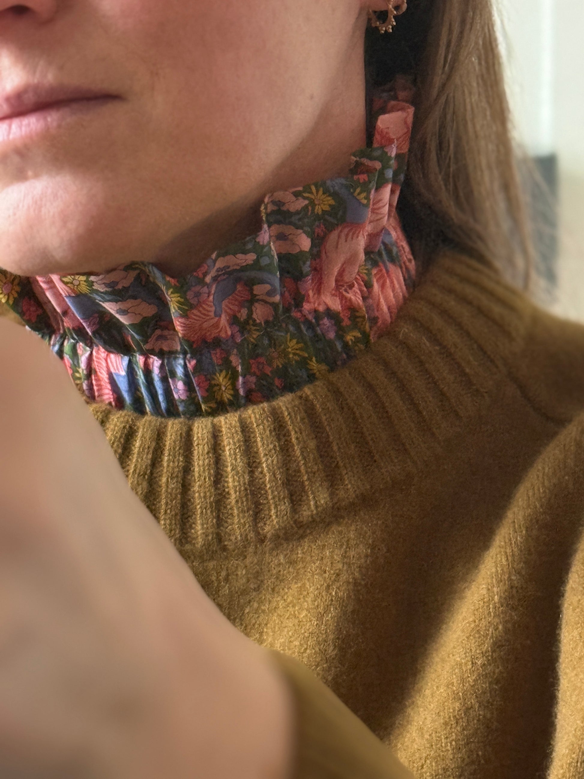 Amovible, il se glisse sous une maille unie pour un look raffiné, ou se porte par-dessus un t-shirt pour un twist mode instantané. Un accessoire facile à mixer, à la fois lumineux, élégant et plein de caractère.