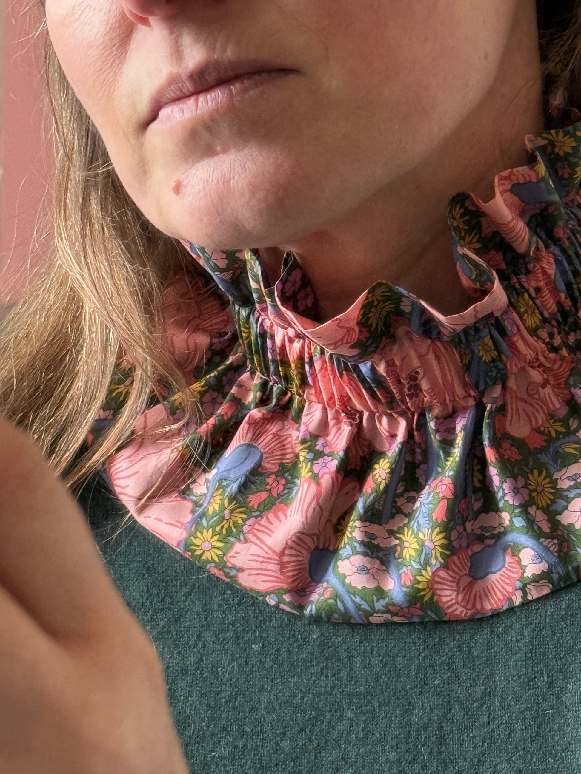 Notre col en tissu Liberty Clementina Daisy mêle de grandes fleurs corail à de minuscules fleurs délicates sur un fond vert gazon. Ce contraste vibrant et frais apporte une touche joyeuse et printanière, idéale pour illuminer toutes tes tenues.