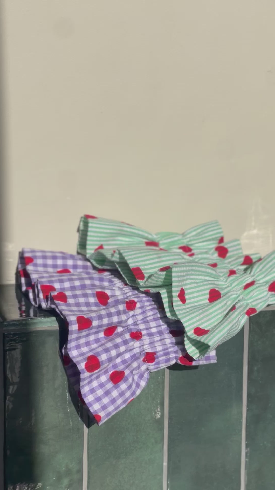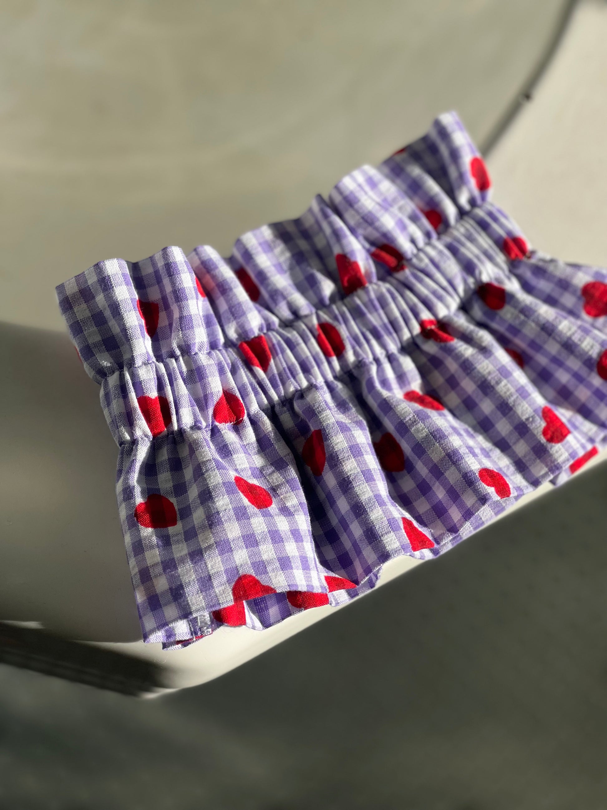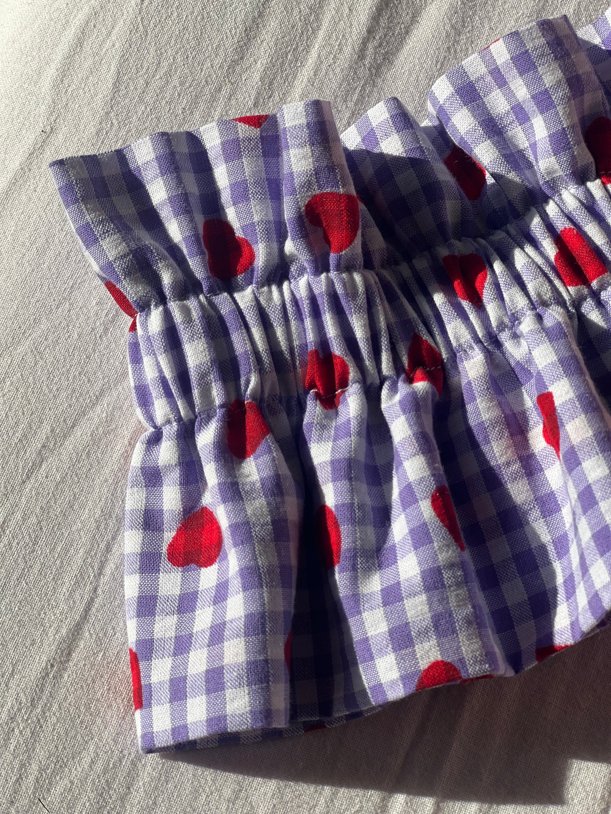 Confectionné dans un délicat seersucker vichy violet, il allie légèreté et raffinement. Son imprimé coeur symbolise l'amour sous toutes ses formes.