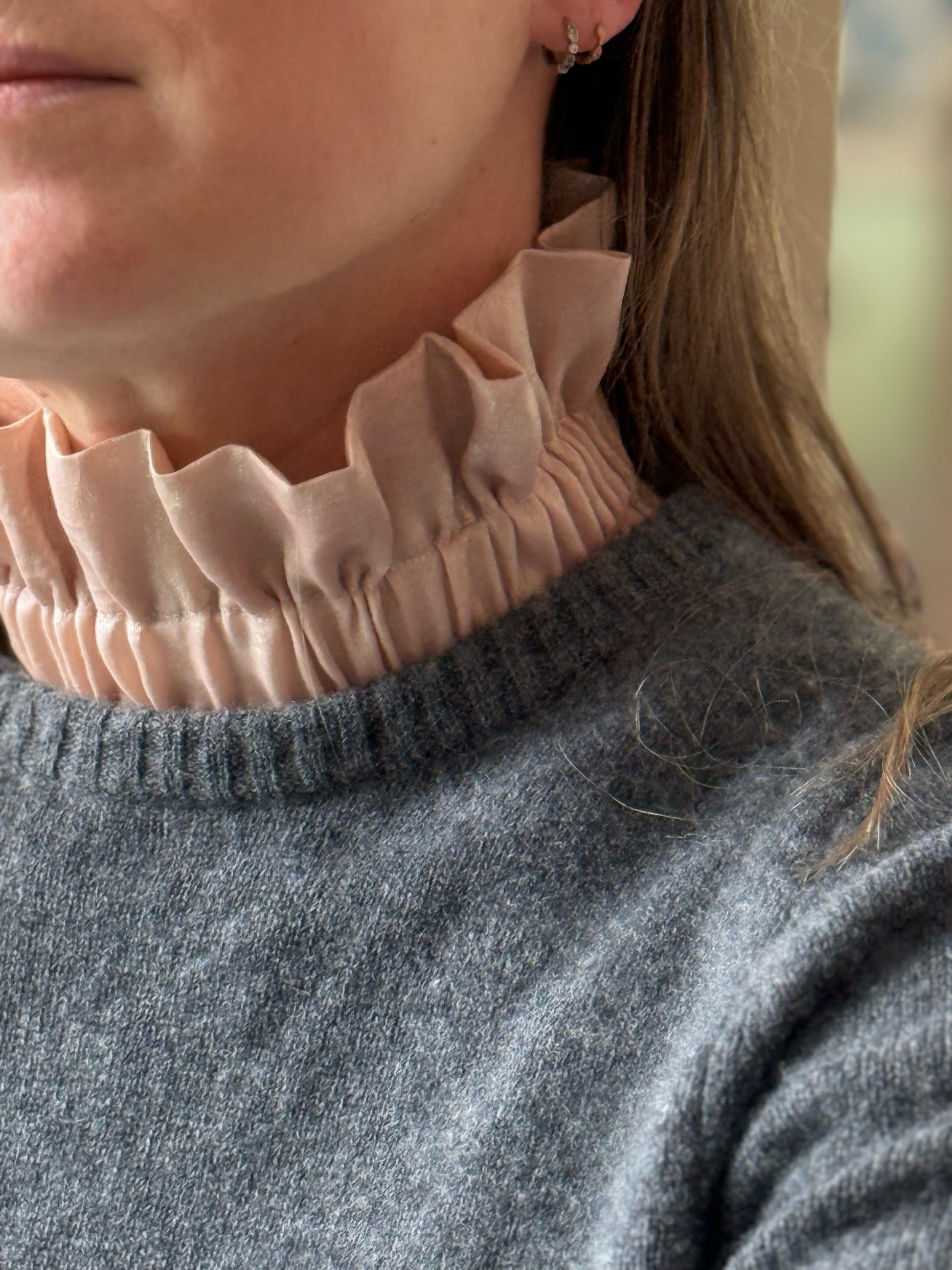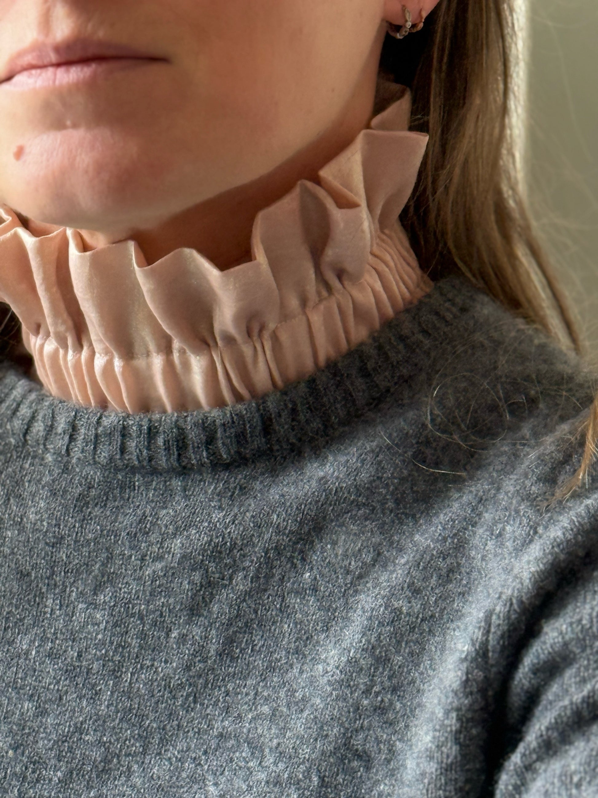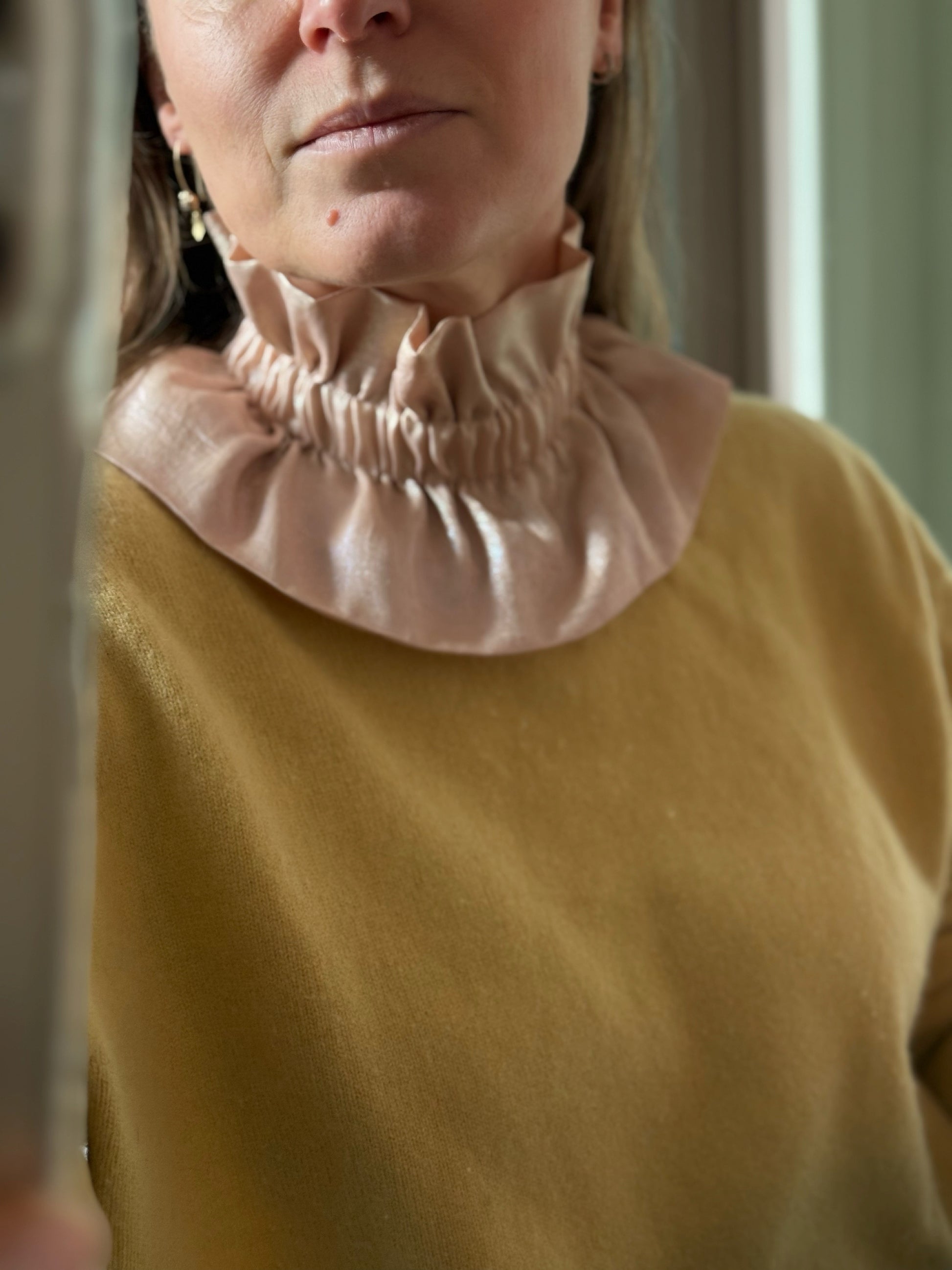 Adoptez l'éclat délicat de notre col rose en crêpe satiné. Sa matière fluide et son fini soyeux captent chaque lumière pour illuminer votre visage et apporter un éclat raffiné à vos tenues.