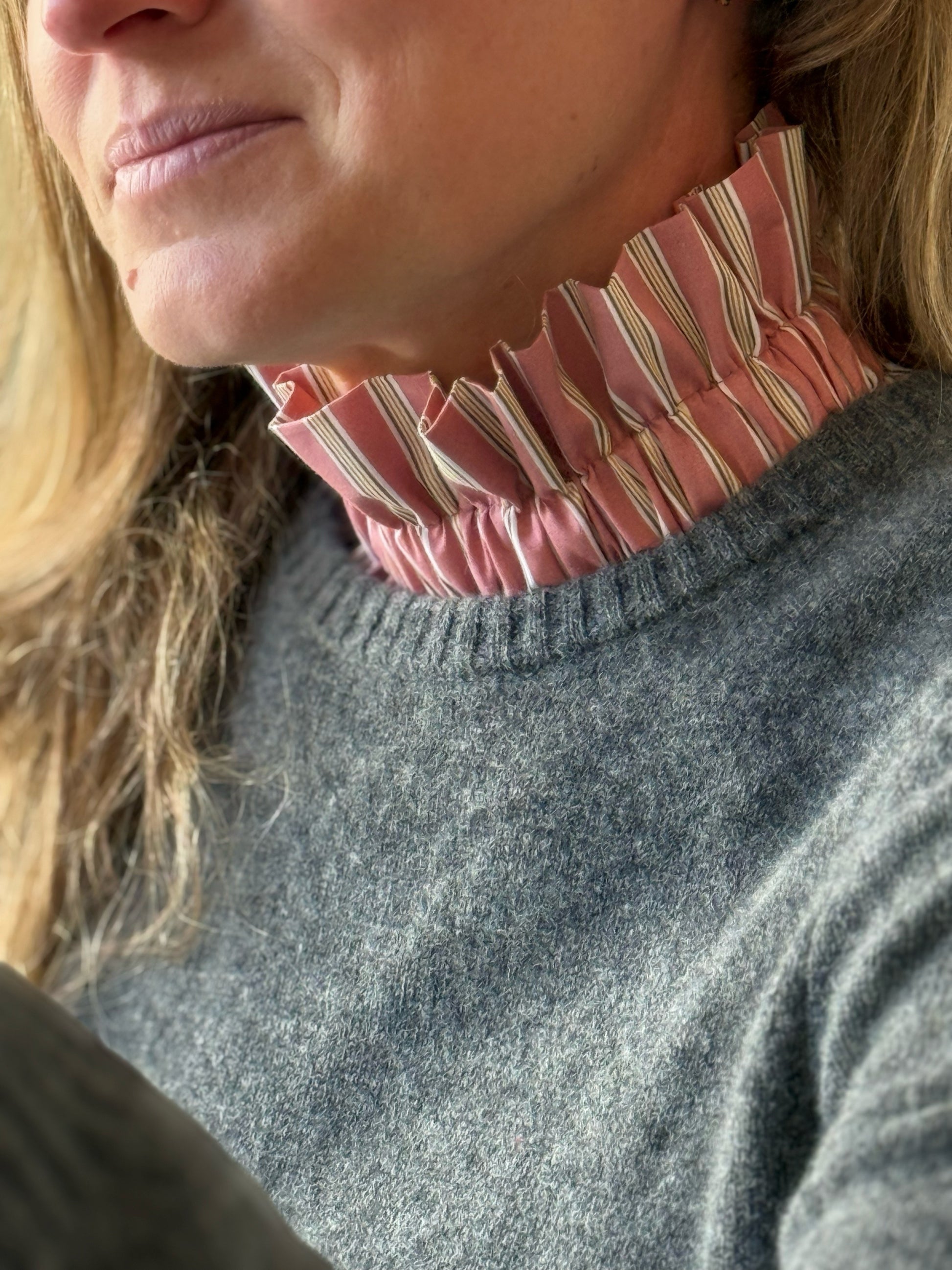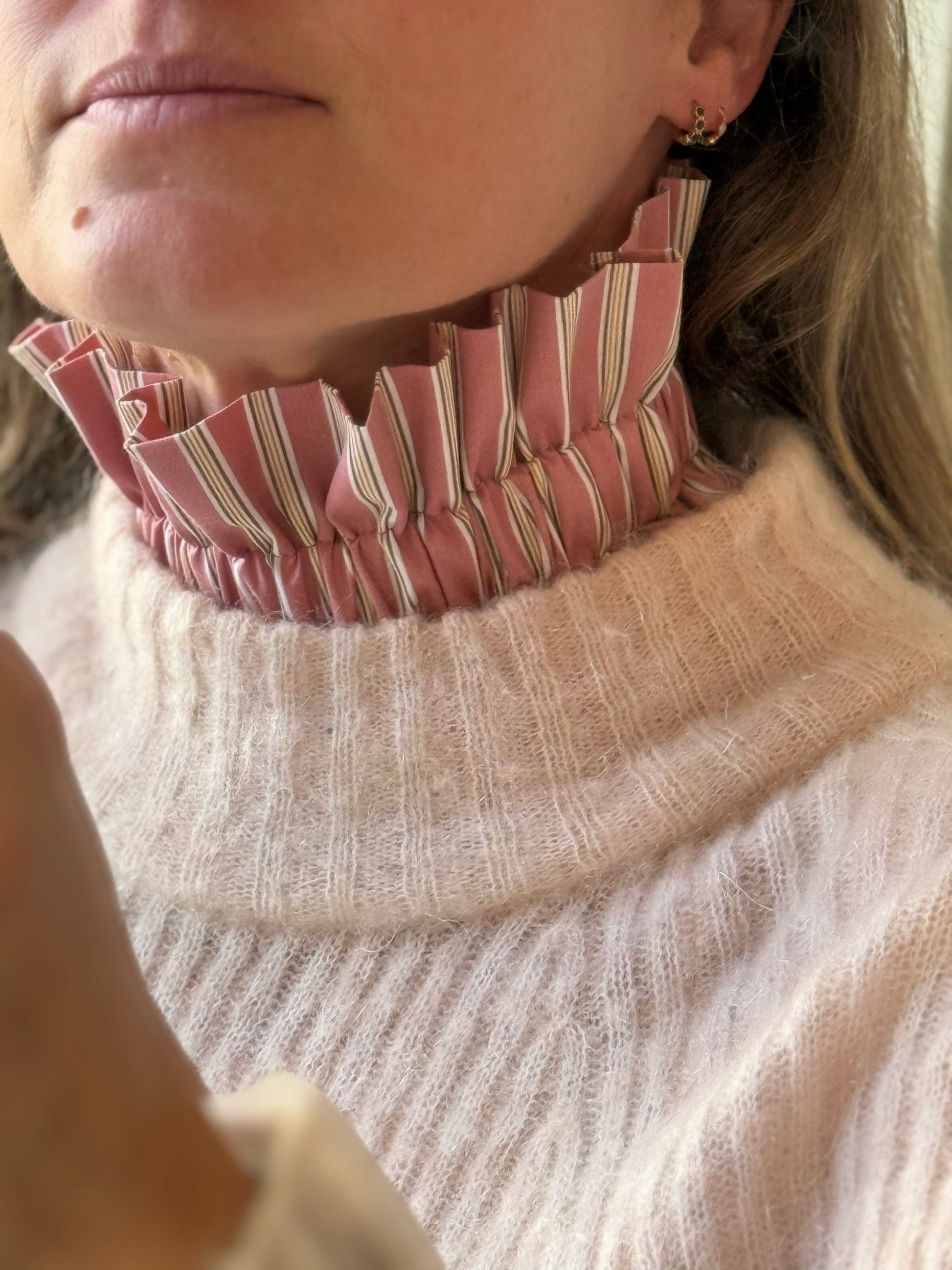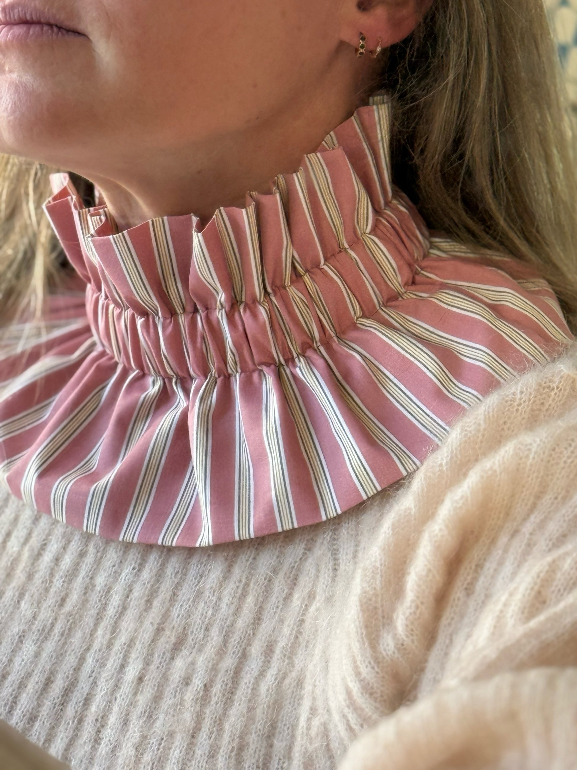 Ajoutez une touche d'élégance et de caractère à vos tenues avec ce col amovible à rayures fond Terracota tout doux et rayures jaunes et vertes, un accessoire résolument intemporel. il apporte l'élégance d'un chemise sans les inconfort de la superposition