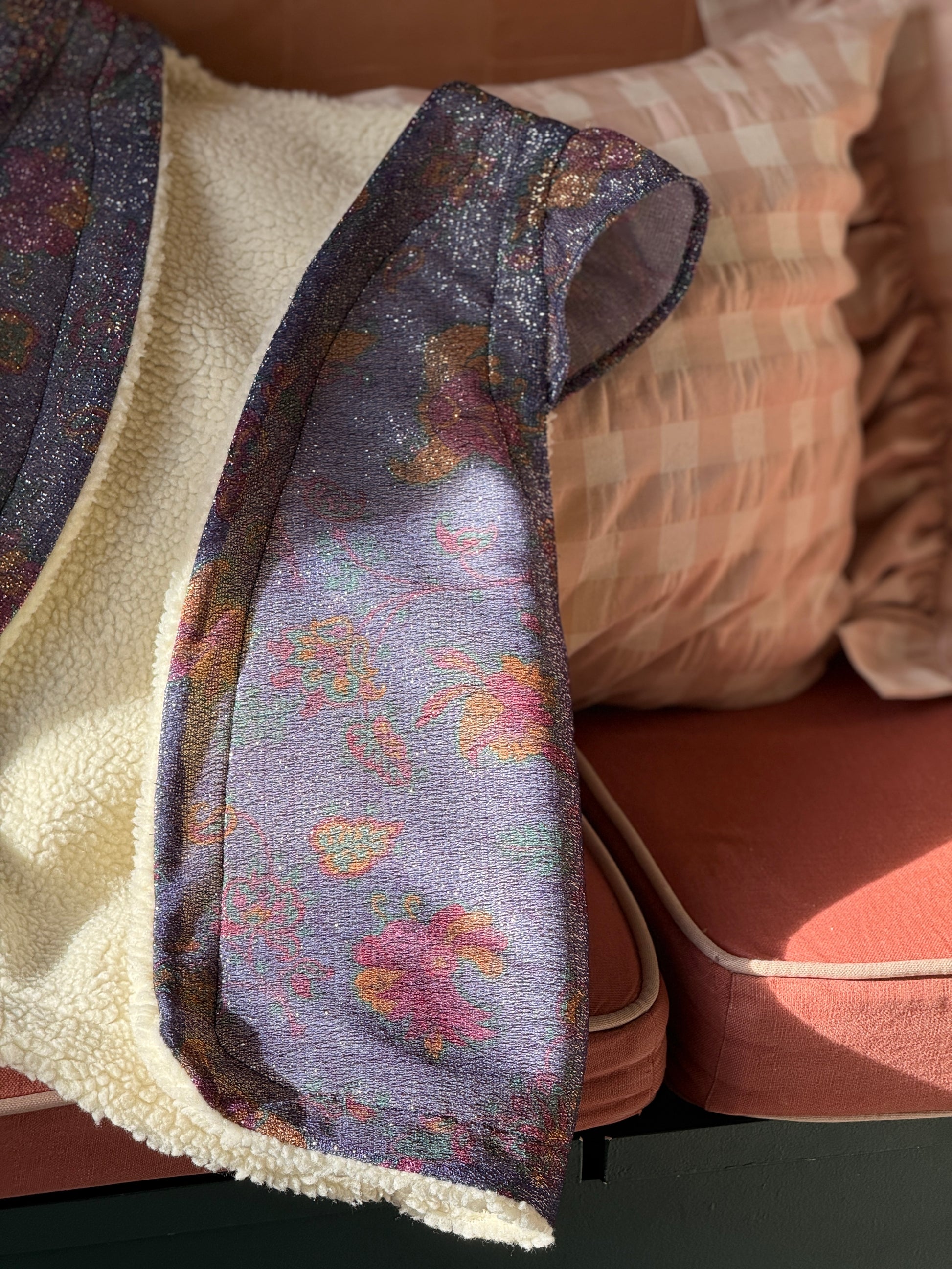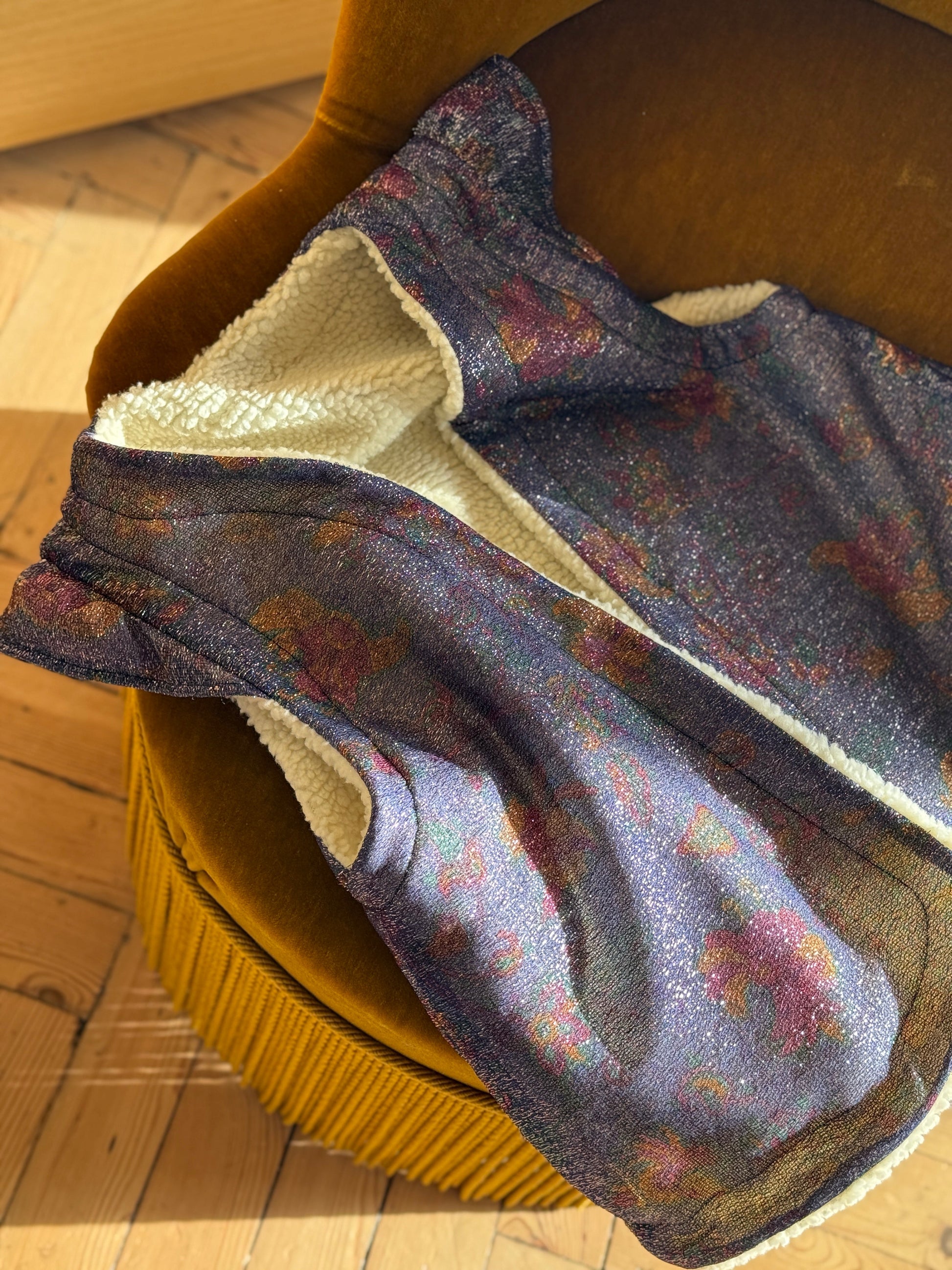 Réalisé en lurex Bleu nuit avec un imprimé floral légèrement vintage, ce gilet femme apporte une touche sophistiquée et intemporelle à votre dressing. Sa doublure en moumoute ultra douce et chaude garantit un confort optimal, sans alourdir la silhouette.